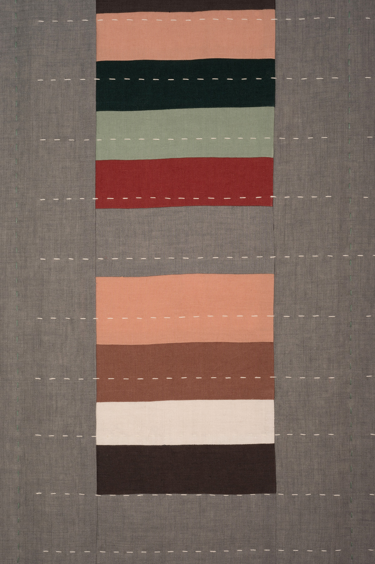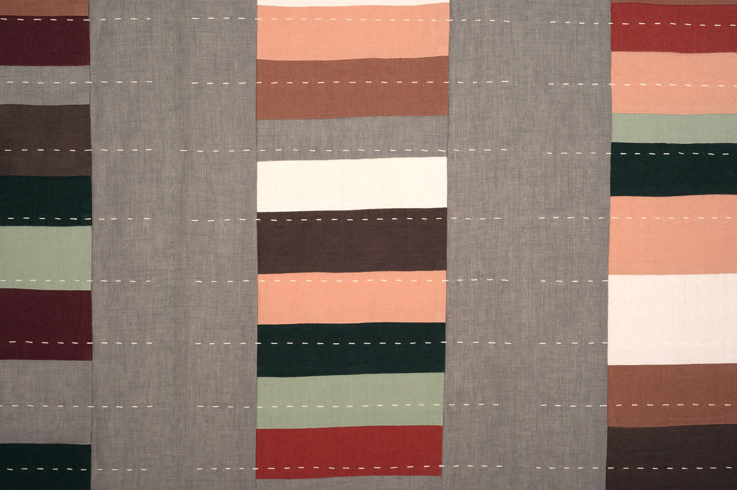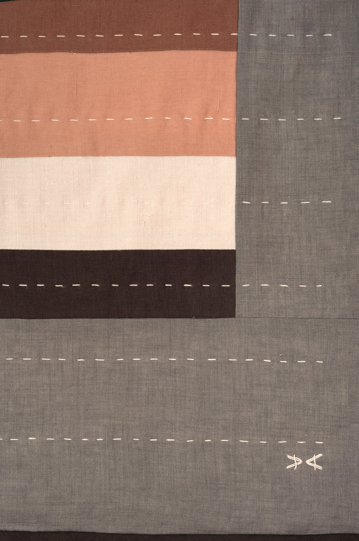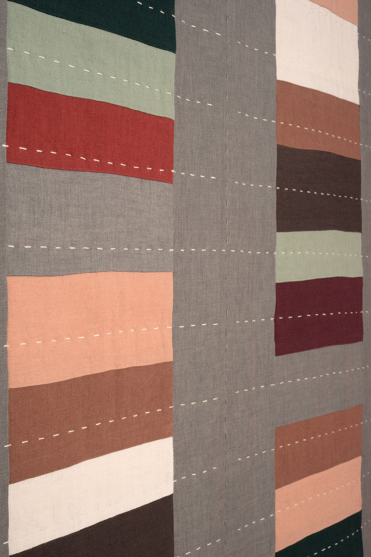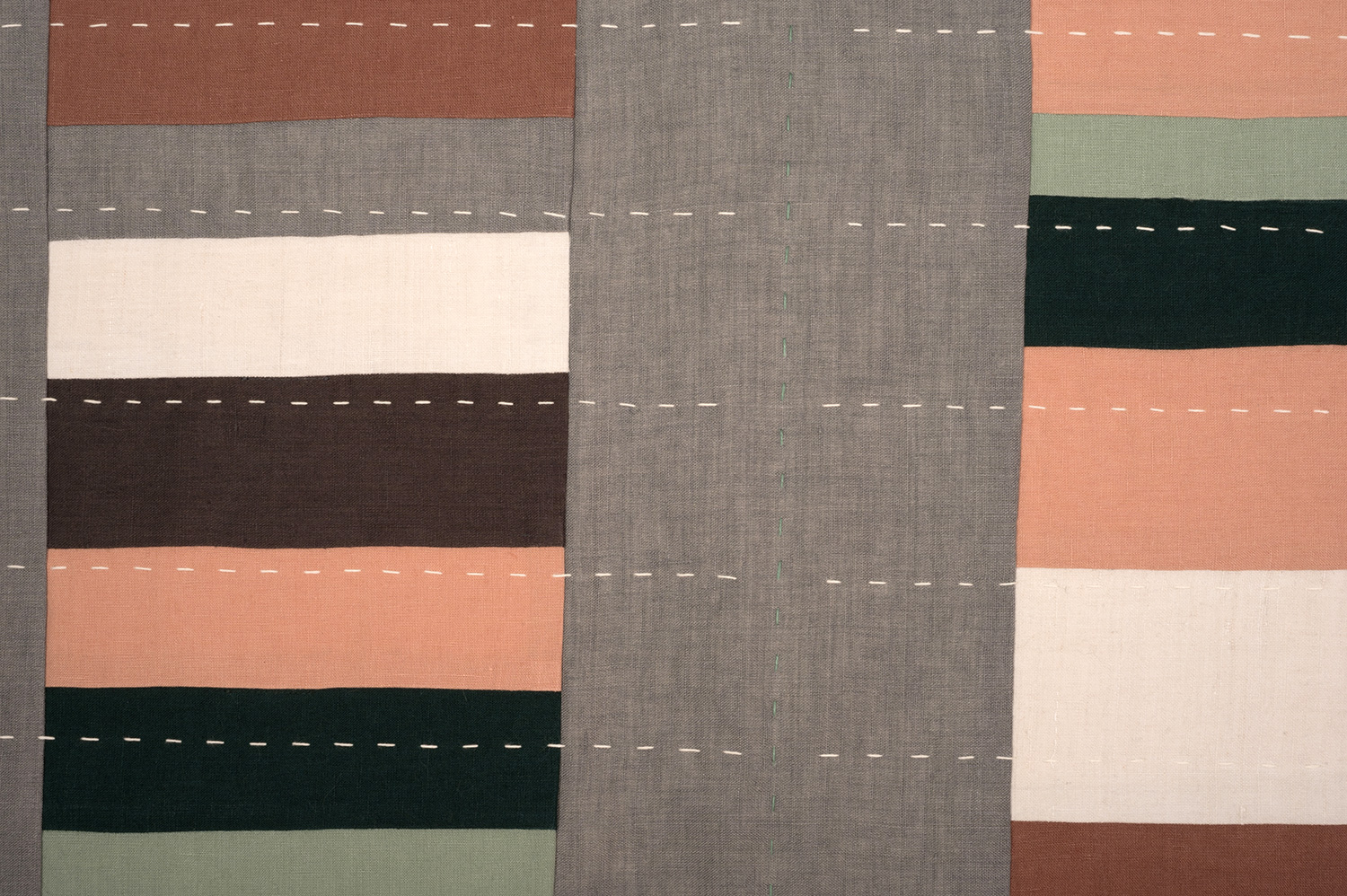 Minimalist quilt made of four layers, with quilt stitches carried out by hand of white and green Sashiko yarn. The geometric pattern in earthy colours on a light grey ground is inspired by Mid-Century Design. Named after the Bauhaus student Lilli Reich.